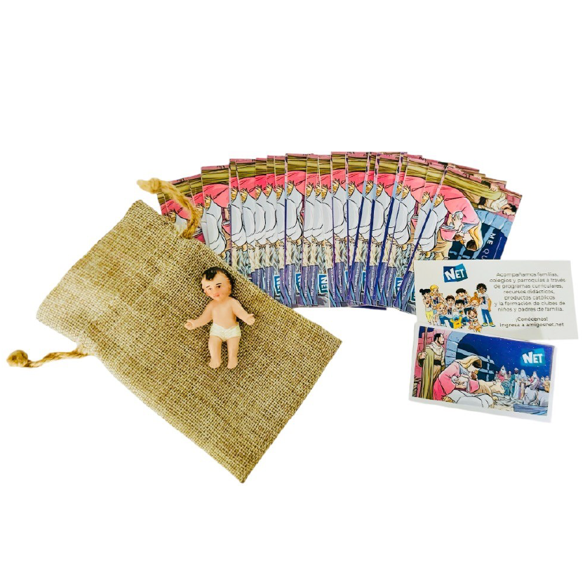 Contiene una figura pequeña del Niño Jesús y veinticinco tarjetas con mensaje.