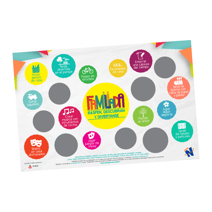 RÁSCALE FAMILIADA: Reúnanse en familia y raspen uno de los círculos para descubrir la actividad a realizar juntos. Sigan raspando hasta haber realizado todas las actividades. Coloca este cartón en un lugar visible.