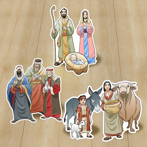 Pieza 1: Jesús, María y José. Pieza 2: los 3 Reyes Magos. Pieza 3: Pastores, burrito, buey y borreguito